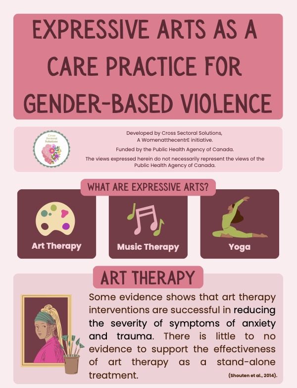 This infographic is the result of a literature review exploring care practices for IPV-BI survivors. This includes expressive arts, cultural/spiritual healing, naturopathy, and it explores their benefits and limitations, and describes various types of care practices.